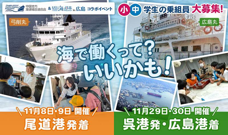 中国地方海運組合連合会は、海と日本プロジェクトin広島(一般社団法人瀬戸内プロジェクトin広島)と共催し、国土交通省中国運輸局、尾道市、日本内航海運組合総連合会、日本財団、 広島商船高等専門学校、弓削商船高等専門学校の協力をいただき、尾道エリア、広島・呉エリアでそれぞれ体験航海事業を行ないます!
