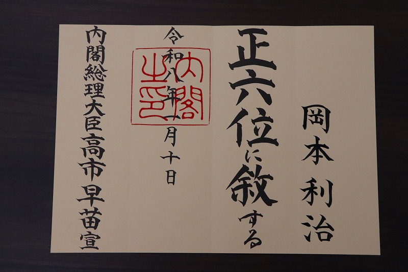故岡本利治氏(第5代中海連会長)叙位のお知らせ