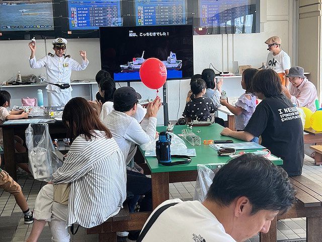 中海連青年部(中国船対協)ではいつもの鉄板ネタ「内航船クイズ」で全問正解者に駄菓子を配るという飛び道具を使って子どもたちを集め、バルーンアートの師匠、西本汽船(株)の西本社長が作ったバルーン作品をプレゼントする手法を用いて「船員になれよ♪」とささやく船〇吉〇のおかみ作戦を展開してまいりました。